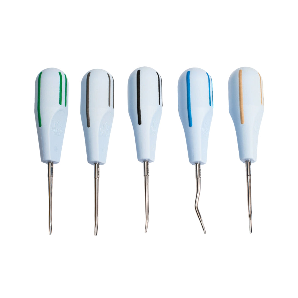 Atraumatic extractions - The fine tapered blade compresses the alveolar bone and cuts the periodontal ligaments, gently easing the tooth from its socket. Reduced damage to the surrounding tissue results in better anatomy for an implant site.